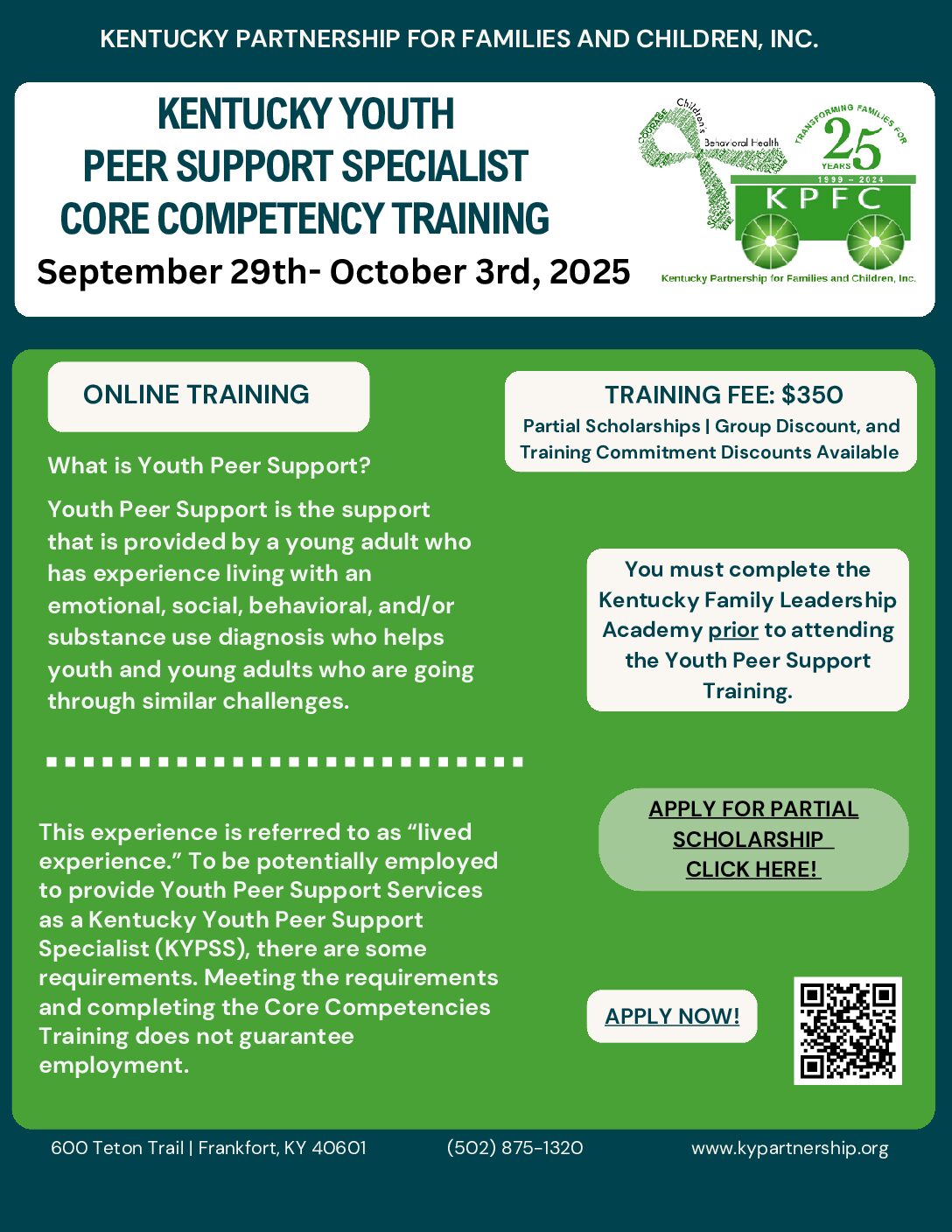 Home Events - KPFC Kentucky YOUTH Peer Support Specialist Core Competency Training (CCT) Kentucky YOUTH Peer Support Specialist Core Competency Training (CCT) Youth Peer Support Training Flyer – September 2025 + Add to Google Calendar + iCal / Outlook export Date Sep 29 2025 - Oct 03 2025 Expired! Time 8:30 am - 4:30 pm Share this event